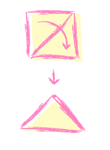 角を合わせて折る、折り線をしっかりつけることはできますか。 今回は、斜めに折る練習をしてみましょう。 折り紙を折るときは、下のように、角を合わせる、辺に合わせるなどの折り方が多いかと思います。 今度は、お子さん自身が、折り加減を決める折り方をしてみましょう。 (下の「いぬ」の耳部分のような折り方です。) 意外と、折り加減を決められず悩んでしまうことや、折る斜めの方向を間違ってしまうことも多いです。特に斜めの方向の違いを見極めるのは難しいものです。 辺や角に合わせない折り方もできると楽しいですね。