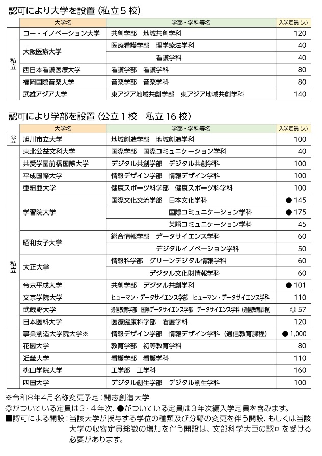 データ資料令和8年度開設予定大学等一覧・令和8年度開設予定学部等一覧(文部科学省ホームページ)より表にして作成