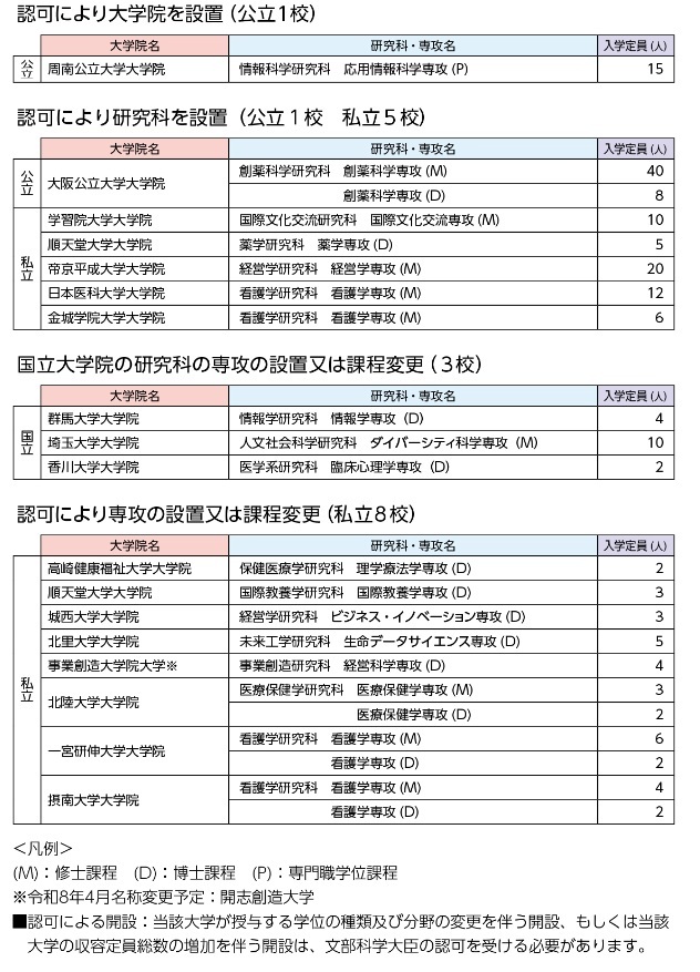 データ資料令和8年度開設予定大学等一覧・令和8年度開設予定大学院等一覧・令和8年度国立大学開設予定研究科等一覧(文部科学省ホームページ)より表にして作成