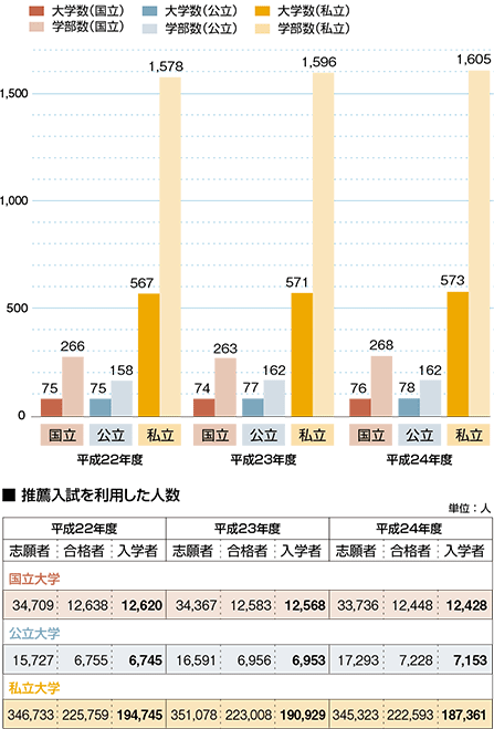 | 推薦入試を実施した国公私立の大学・学部数(平成22~24年度) |