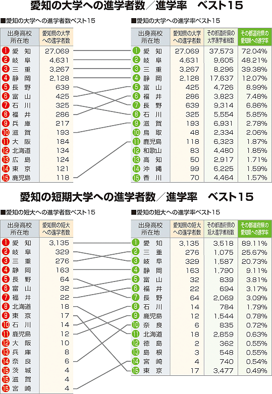 | 愛知への進学者数と「大学・短大進学者のうち何%が愛知に進学したか」という進学率の2つの視点から都道府県別にまとめました。 |