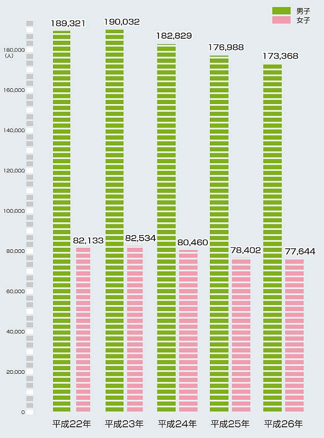 | データ資料: | 各年の学校基本調査報告書 平成26年は学校基本調査速報(平成26年8月発行)より<文部科学省> |