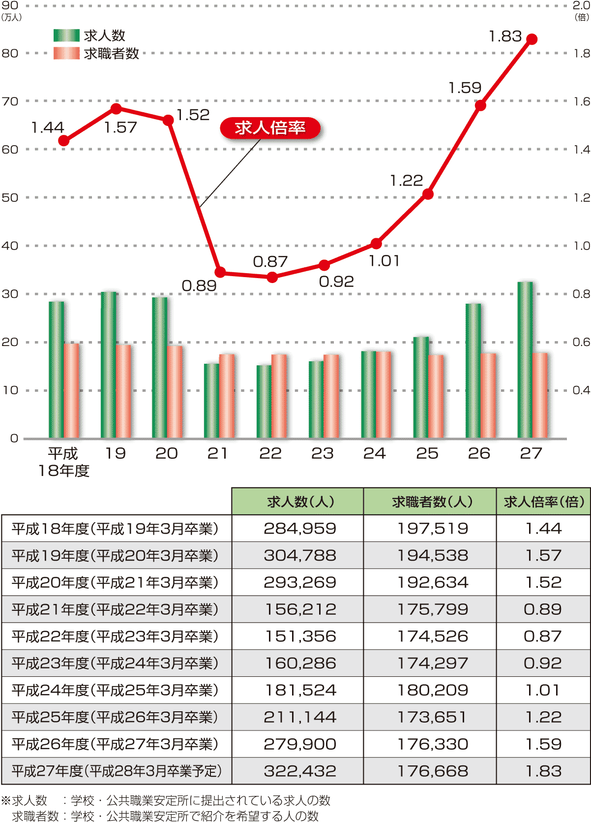 | データ資料: | 平成27年度高校・中学新卒者の求人・求職・内定状況(平成27年9月末現在)について <厚生労働省のホームページ>よりグラフ・表にして作成 |