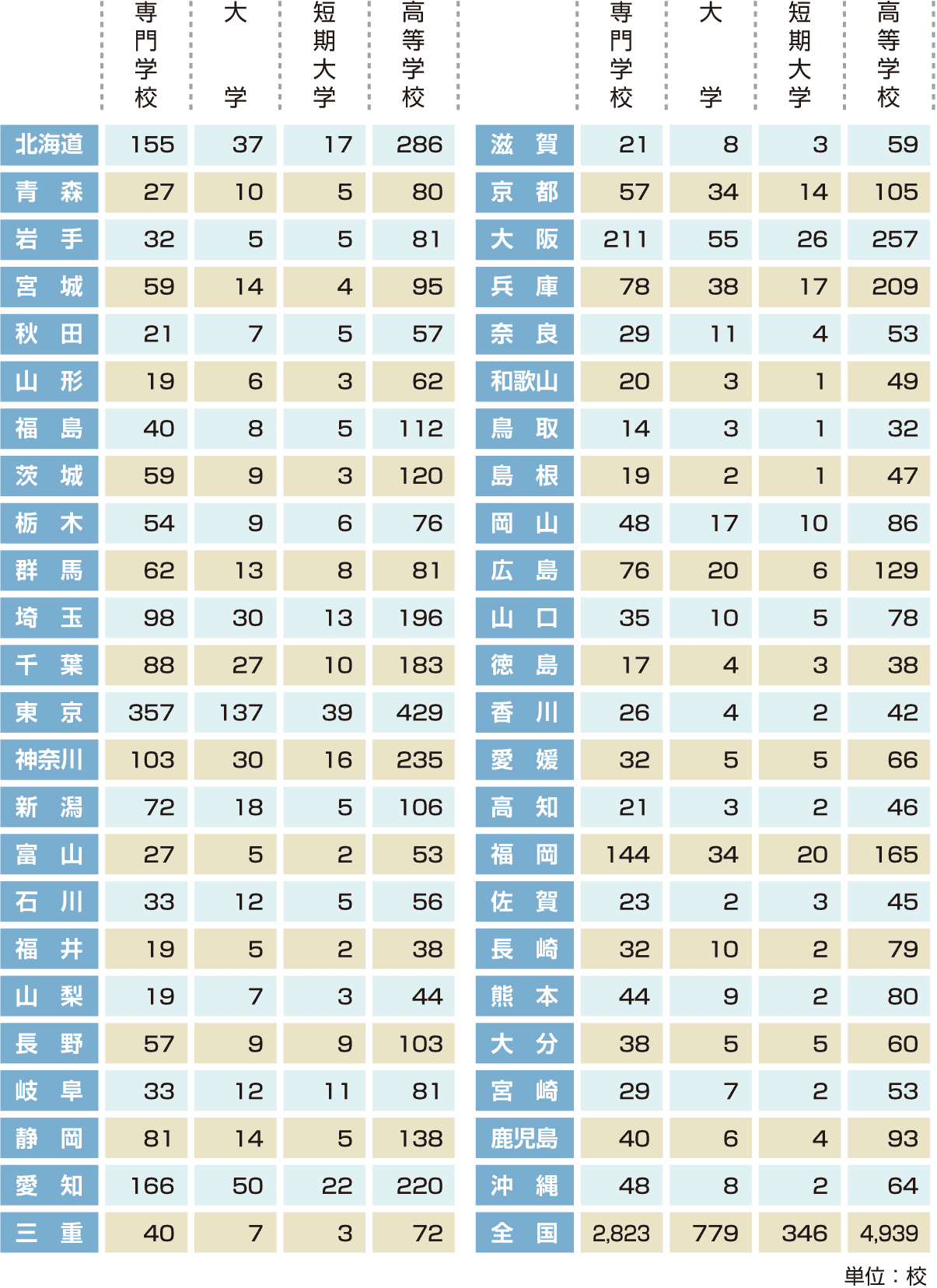 | 都道府県別/専門学校・大学・短期大学・高等学校 |