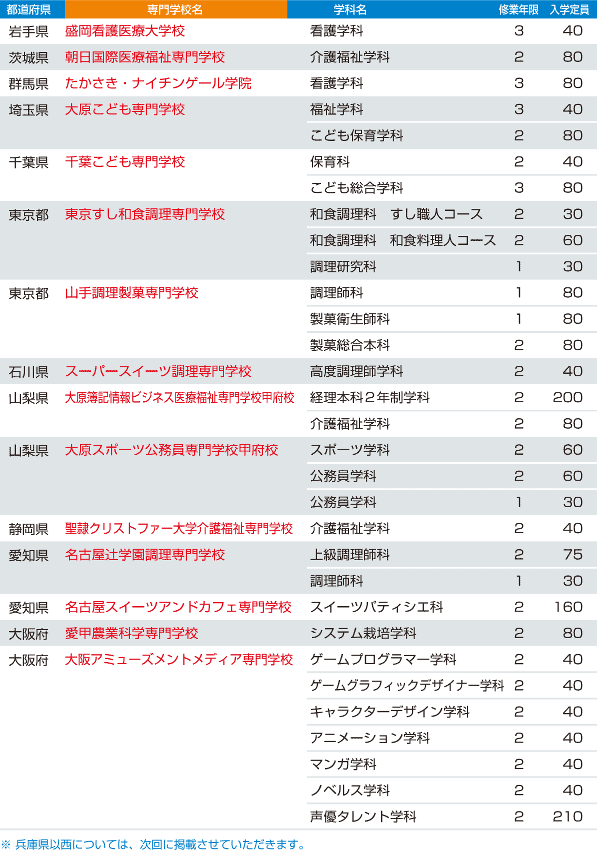 | ※ | 各都道府県にて認可を受け、2016年4月に開校された私立の専修学校の専門課程を記載しています。 各都道府県の私立学校担当の部署へ調査した結果です。 |