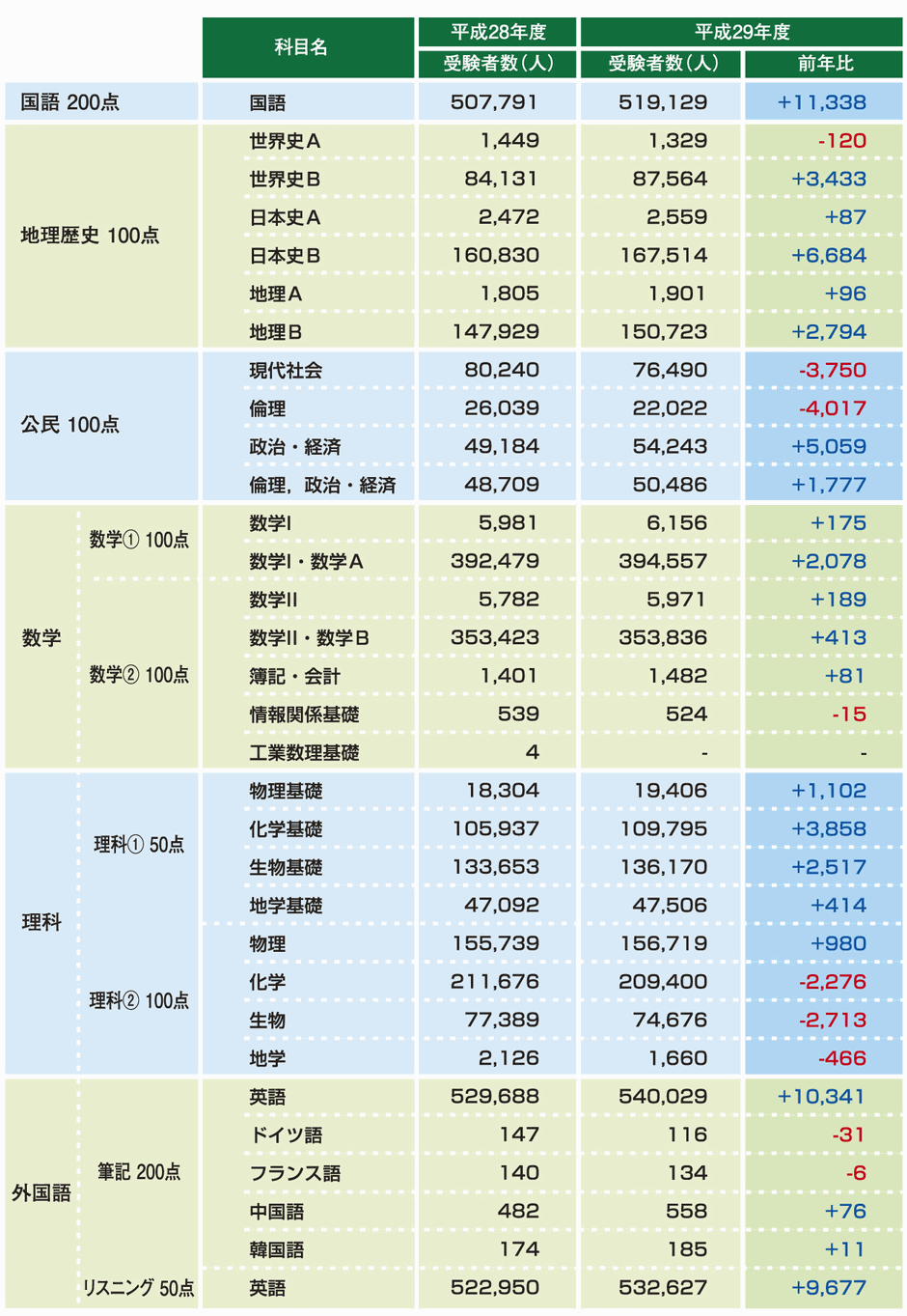 | センター試験における過去2年間の教科別受験者数の推移です。 |