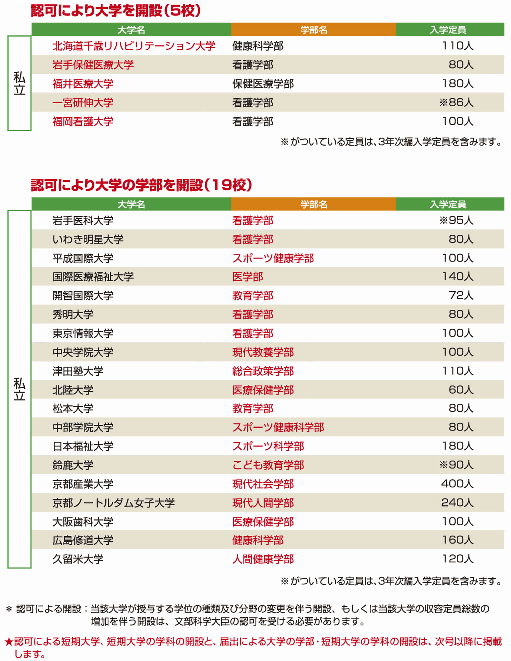 平成29年度開設予定大学等一覧、平成29年度開設予定学部等一覧 <文部科学省ホームページより表にして作成> |