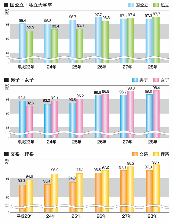 | 6年間の就職率*の推移(平成23年~28年) | *就職率は、就職希望者のうち、就職した人の割合です。 |