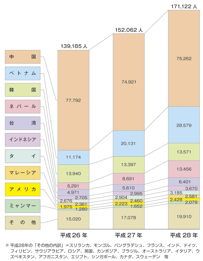 | データ資料: | 「平成28年度外国人留学生在籍状況調査結果」 独立行政法人日本学生支援機構のホームページよりグラフにして作成 |