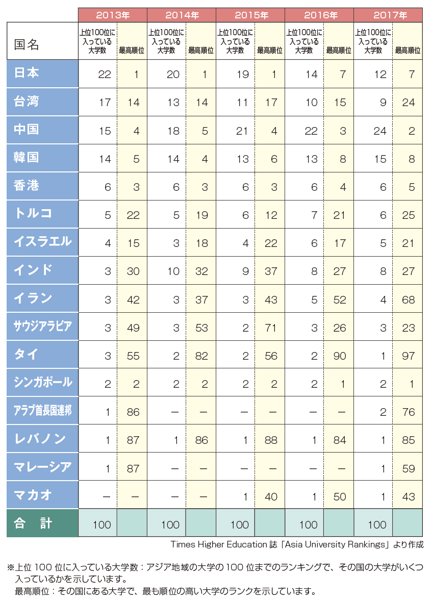 | 2013年以降、各国の大学がアジア上位100位に入っている数と、 その国の大学のアジア地域での最高順位の過去5年間の変遷です。 |