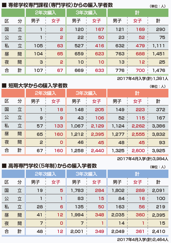 | データ資料: | 平成30年度学校基本調査速報 文部科学省ホームページ(平成30年8月発表)より表にして作成 各表下にある昨年の編入学者数は平成29年度学校基本調査より |