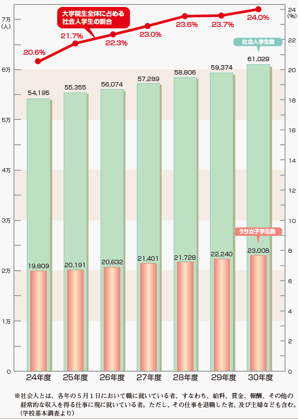| 大学院生全体に占める社会人学生の割合と学生数 |