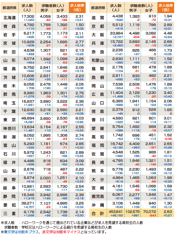 | データ資料: | 平成30年度「高校・中学新卒者のハローワーク求人に係わる 求人・求職・就職内定状況」取りまとめ(平成30年9月末現在) 厚生労働省のホームページより表にして作成 |