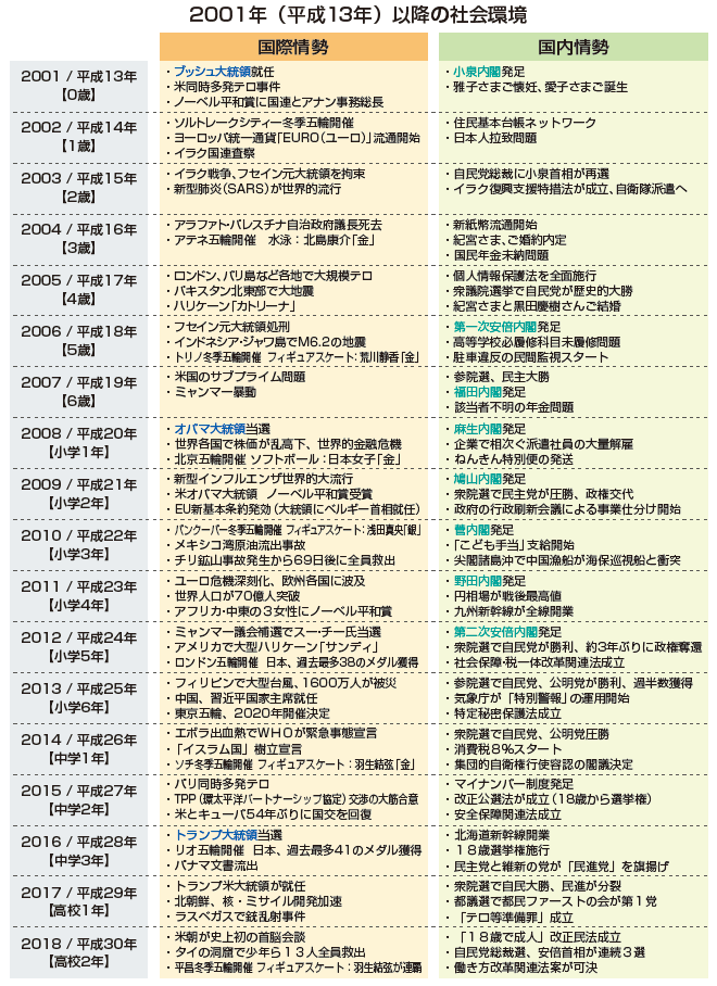 | 高校3年生が経てきた社会(1) | 現在の高校3年生が育った時代背景を理解するための一助として、ご高覧いただ ければ幸いです。 |