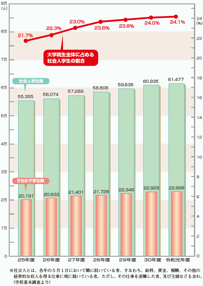 | 大学院生全体に占める社会人学生の割合と学生数 |