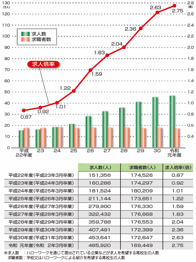 | データ資料: | 令和元年度「高校・中学新卒者のハローワーク求人に係る求人 ・求職・就職内定状況」取りまとめ(令和元年9月末現在) 厚生労働省のホームページよりグラフ・表にして作成 |