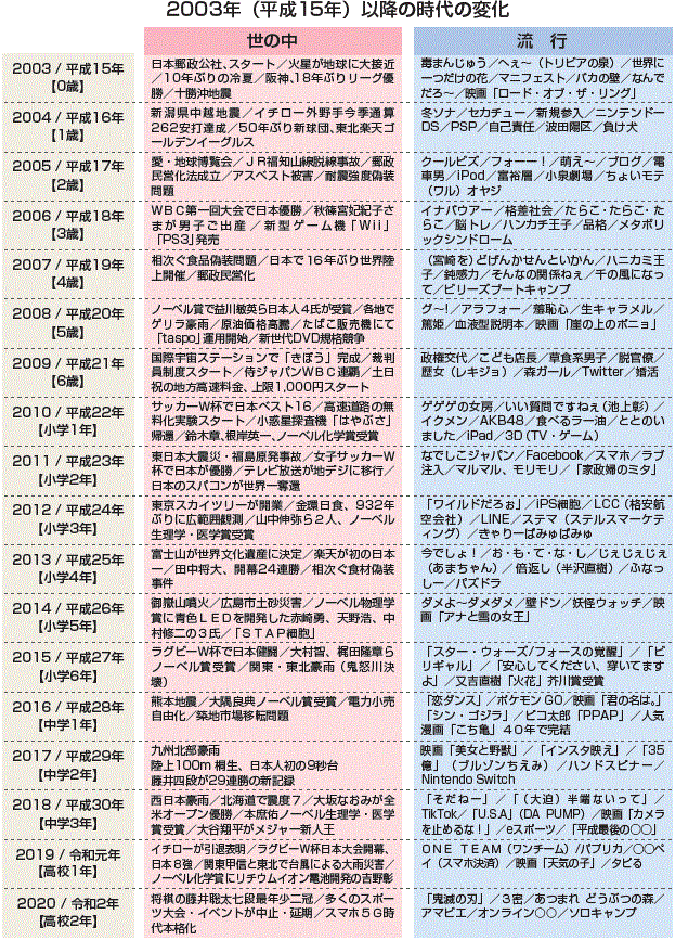 現在の高校3年生が生まれた年から、昨年までの「世の中」と「流行」をまとめま