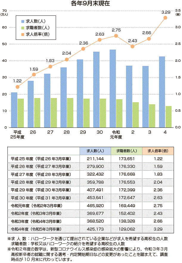 | データ資料 | : | 「令和4年度 高校・中学新卒者のハローワーク求人に係る求人・求職・就職内定状況取りまとめ(令和4年9月末現在)」 厚生労働省のホームページよりグラフ・表にして作成 |
