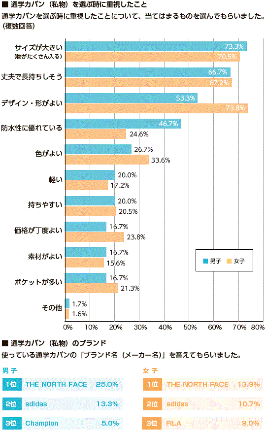 | 調査対象 | : | 通学カバンに私物のカバンを使っている高校生男子60名、女子122名 |