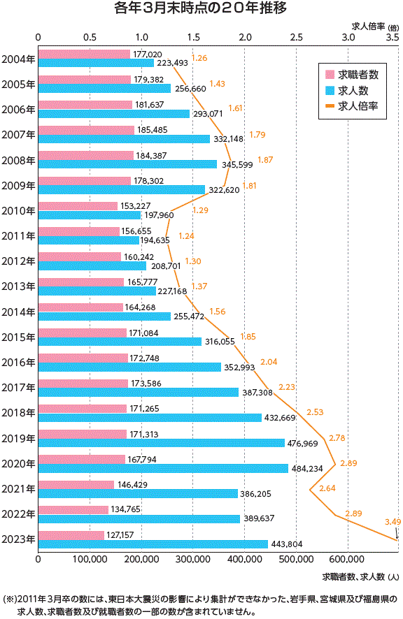 | データ資料 | : | 令和4年度「高校・中学新卒者のハローワーク求人に係る求人・求職・就職内定状況」取りまとめ(令和5年3月末現在) 厚生労働省のホームページよりグラフにして作成 |