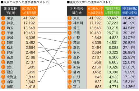 | 東京への進学者数と「大学・短大進学者のうち何%が東京に進学したか」という進学率の2つの視点から都道府県別にまとめました。 |