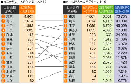東京の短期大学への進学者数/進学率 ベスト15 |