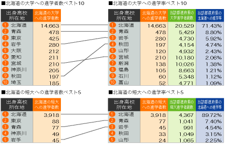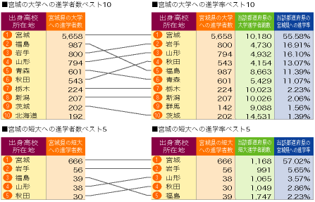 | 北海道、宮城への進学者数と「大学・短大進学者のうち何%が北海道、宮城に進学したか」という進学率の2つの視点から都道府県別にまとめました。 |