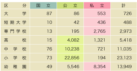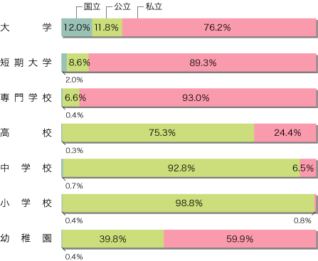 | 私立の学校の占める割合は、幼稚園で59.9%、小学校で0.8%、中学校で6.5%、高校で24.4%となっております。教育分野の情報としてご参考になれば幸いです。 |