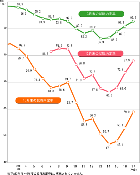 | 高等学校新規卒業者の10月末、12月末、3月末時点における「就職内定率」を、過去15年間の推移としてグラフ化しました。 |