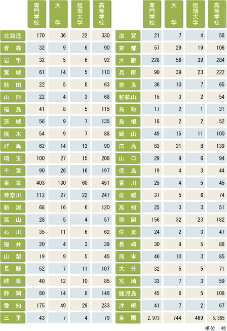 都道府県別/専門学校・大学・短期大学・高等学校 |