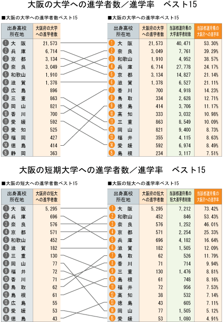 | 大阪への進学者数と「大学・短大進学者のうち何%が大阪に進学したか」という進学率の2つの視点から都道府県別にまとめました。 |
