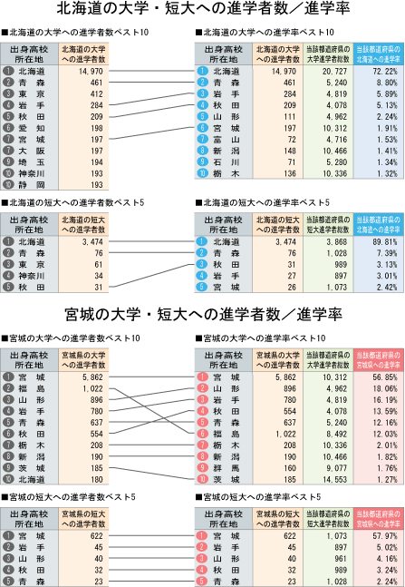 | 北海道、宮城への進学者数と「大学・短大進学者のうち何%が北海道、宮城に進学したか」という進学率の2つの視点から都道府県別にまとめました。 |