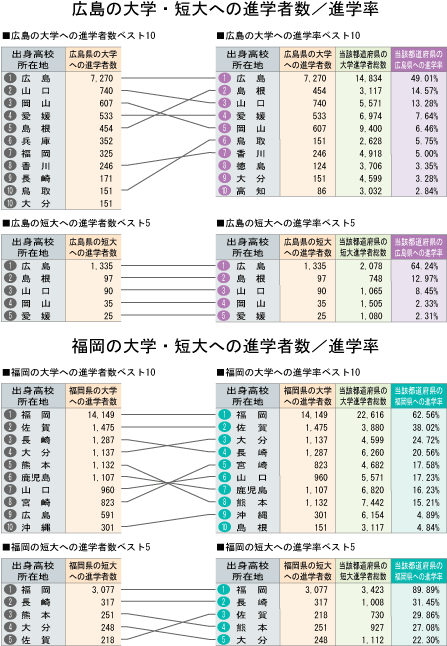 | 広島、福岡への進学者数と「大学・短大進学者のうち何%が広島、福岡に進学したか」という進学率の2つの視点から都道府県別にまとめました。 |