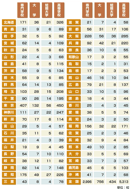 | 都道府県別/専門学校・大学・短期大学・高等学校 |