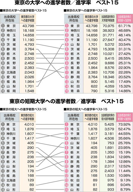 | 東京への進学者数と「大学・短大進学者のうち何%が東京に進学したか」という進学率の2つの視点から都道府県別にまとめました。 |