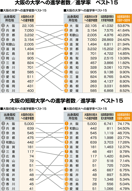 | 大阪への進学者数と「大学・短大進学者のうち何%が大阪に進学したか」という進学率の 2つの視点から都道府県別にまとめました。 |