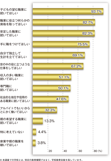 | 調査時期:平成19年1~2月 発表時期:平成19年10月 調査対象:30歳~59歳までの保護者1,372人 データ資料:子どもの将来とキャリア教育・キャリアガイダンスに対する保護者の意識 <労働政策研究・研修機構> |