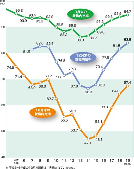 高等学校新規卒業者の10月末、12月末、3月末時点における「就職内定率」を、過去15年 間の推移としてグラフ化しました。 |
