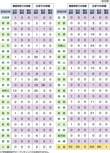 専修学校、大学の授業を高校生が受講することで、高校の単位として認定する取り 組みがあり、その実施校数をまとめました。 |