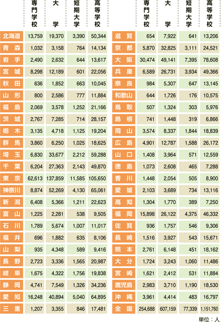 | 調査時期:平成20年5月1日現在 データ資料:平成20年度学校基本調査速報(平成20年8月発行)より ※高等学校の数値は、平成20年5月時点で1年に在籍する学生数(全日制+定時制) <文部科学省生涯学習政策局調査企画課発行> |