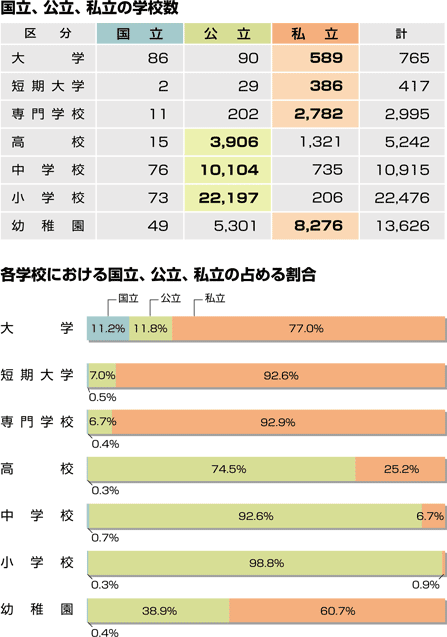 私立の学校の占める割合は、幼稚園で60.7%、小学校で0.9%、中学校で6.7%、高 校で25.2%となっています。 |