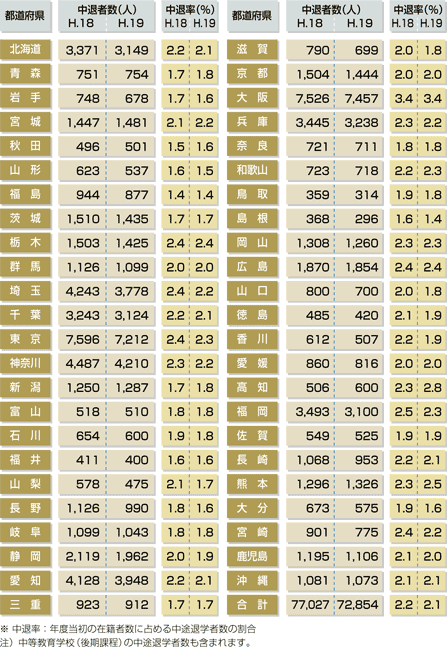 | 平成18年度、19年度の都道府県別高校中退率を示しました。最も上昇したのは高 知県の0.5ポイントでした。 |