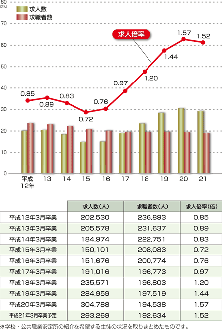 | 発表時期:平成20年11月 データ資料:平成20年度高校・中学新卒者の就職内定状況等(平成20年9月末現在)について <厚生労働省> |