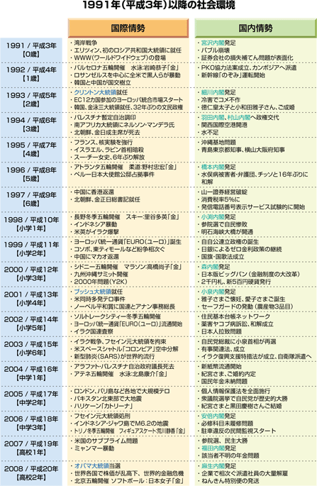 WWW(ワールドワイドウェブ)が登場した年に、現在の高校3年生は生まれました。彼らの育った時代背景を理解するための一助として、ご高覧いただければ幸いです。 |