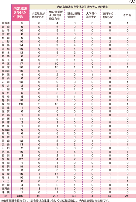 | データ資料: | 高等学校の平成21年3月新規卒業予定者の就職内定取消状況 (平成21年3月31日現在)に関する調査について<文部科学省> |