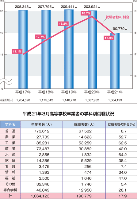 | データ資料: | 「平成21年3月高等学校卒業者の就職状況(平成21年3月末現在)に関する調査について」 <文部科学省初等中等教育局児童生徒課> |