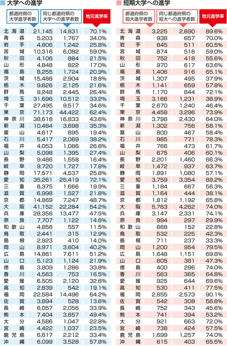 | 2009年3月の高校新卒者が、出身高校と同じ都道府県の大学・短期大学へ進学した割合です。 |