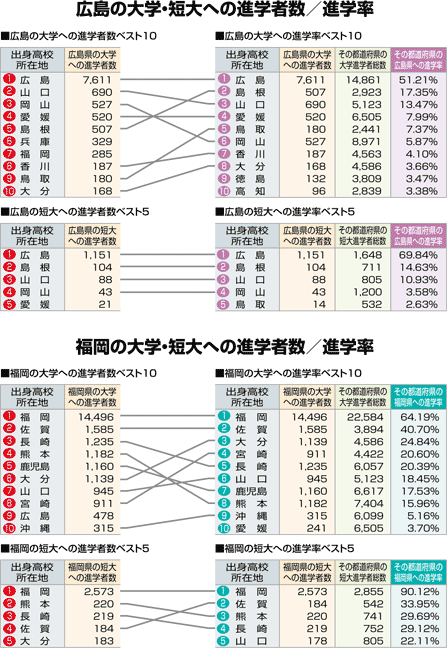 | 広島、福岡への進学者数と「大学・短大進学者のうち何%が広島、福岡に進学したか」という進学率の2つの視点から都道府県別にまとめました。 |