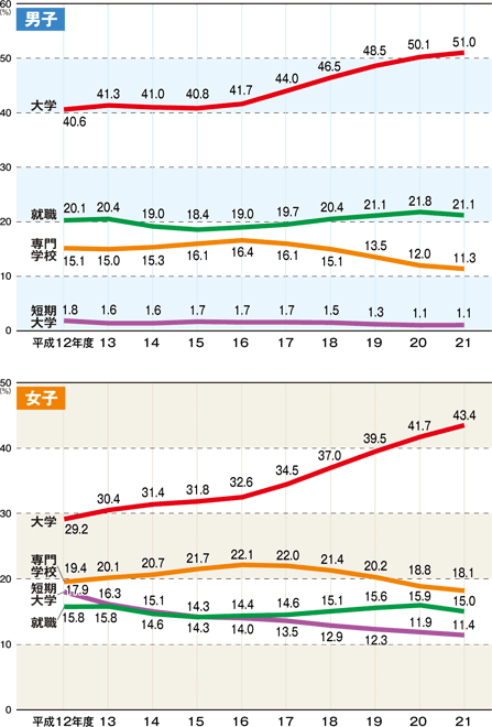 | データ資料: | 各年の学校基本調査報告書<文部科学省> ※平成21年度は、平成21年度学校基本調査速報(平成21年8月発行)より |