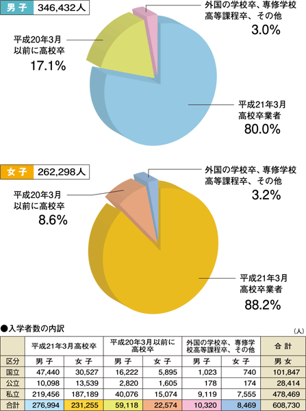 平成21年4月大学入学者のうち、同年3月に高校を卒業した学生(現役入学者)の占める割合は、男子80.0%、女子88.2%です。 |